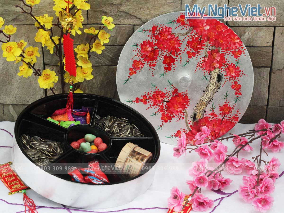 Hộp mứt sơn mài 6 ngăn khay rời vẽ hoa đào.